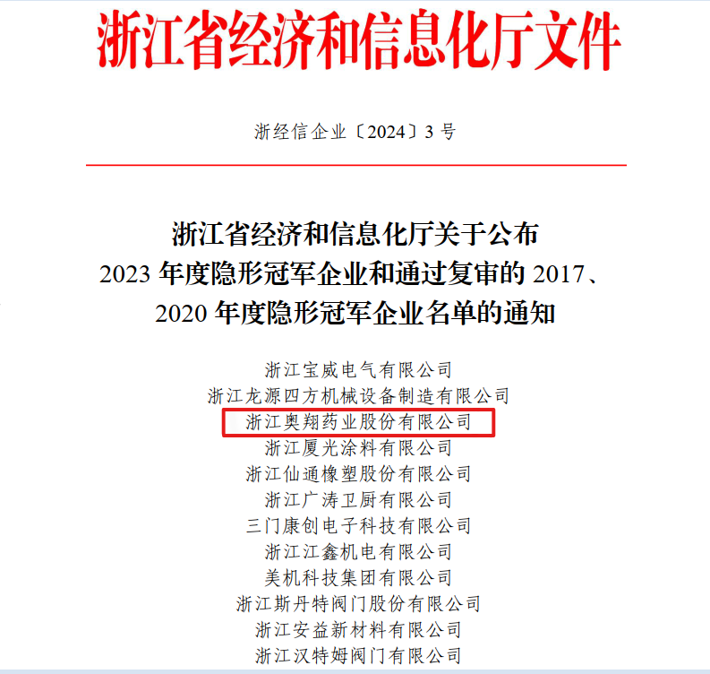 喜讯!2024年1月9号收到浙江省经济和信息化厅文件通知,公司被认定为2023年度浙江省隐形冠军企业。